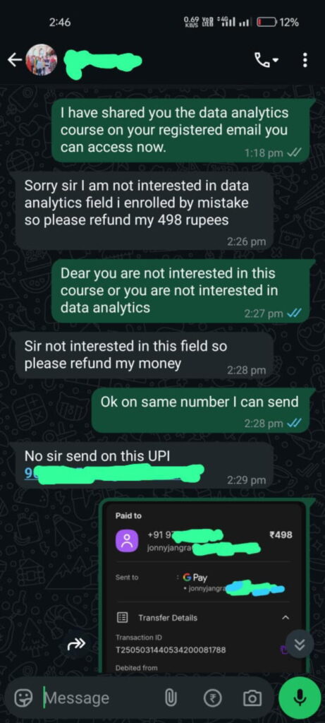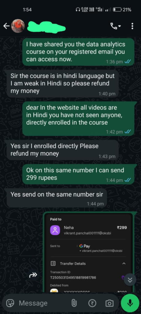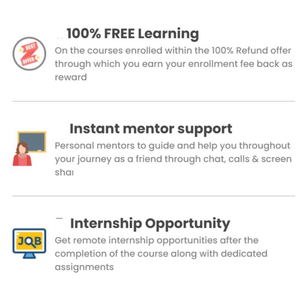 You will receive the refund through your original mode of payment once you complete the course and submit the required assignments/exercises/projects within the given time frame.